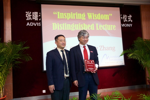 仪式上,中国科学院院士、交大副校长梅宏为张曙光颁发了顾问教授聘书,并为其佩戴校徽。梅宏校长代表学校对张曙光教授的到来表示欢迎,希望张曙光的到来能够进一步促进学术交流,特别是促进本科生和研究生在学习和研究上的交流;在我校的学科发展和微生物代谢国家重点实验室建设方面提出方向性和指导性的意见;在学校对生命科学及相关领域的研究人员进行国际评估时,依据国际学术标准提出合理化的意见和建议,并提供相应帮助。