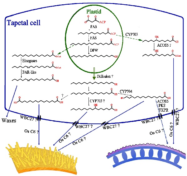 我校张大兵教授研究团队和美国、德国等科研小组合作,经过近7年的研究,克隆并鉴定了一个参与单子叶植物水稻花药及花粉外壁发育的脂肪酰基载体蛋白还原酶(Fatty Acyl Carrier Protein Reductase ),DPW(Defective Pollen Wall),并提出了花药表皮和花粉外壁发育新途径(如下图所示)。该研究成果发表在《植物细胞》(The Plant Cell,June 24, 2011)。