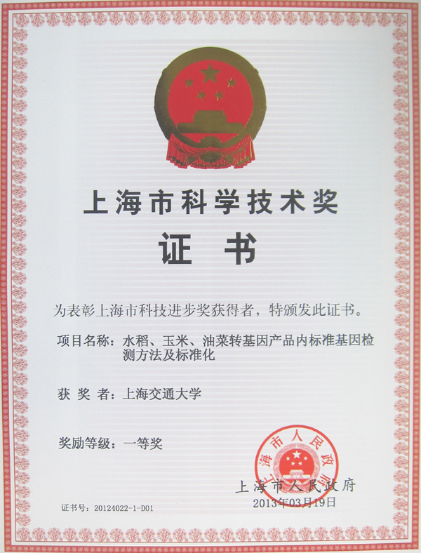 2013年4月19日上午,上海市委、市政府在上海展览中心友谊会堂举行2012年度上海市科学技术奖励大会。我院张大兵教授作为“水稻、玉米、油菜转基因产品内标准基因检测方法及标准化”项目负责人,荣获2012年度上海市科技进步一等奖。