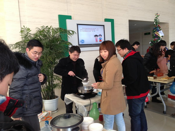 上午10:00,学院大厅已经布置的一片喜气——五颜六色的气球、拉花和窗花象征着新年的红红火火,热气腾腾的元宵正在锅里翻滚,丰厚的礼品像小山般高高堆起,圣诞树上挂满了各种有趣的小灯谜,还有投飞镖等各种小游戏供同学们娱乐放松……