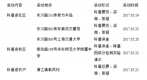 上海交大生物转基因科普教育基地于2012年底正式对外开放。在农业部、上海市农委、上海市科委科协和闵行区科委科协等单位的指导和帮助下,采用”进社区、进校区和进农户”的“三进”和实地参观和现场演示的“请进来”等方式,组织举办了一系列的具有影响的转基因科普公益活动,积累了丰富的科普经验。2016年,科普基地的受众超过1.5万人次。在提高社会大众对转基因的正确认知的基础上,为上海乃至全国转基因科普教育工作做出了重要贡献。目前,该基地已经成为农业部、共青团中央、中国科协的科普教育基地。