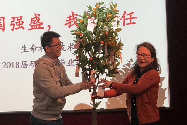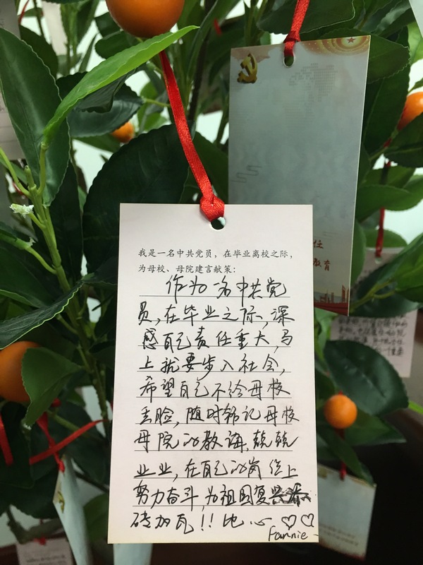 毕业生党员代表杨逸凡向学院赠送人才培养树,树上悬挂的卡片,写着全体毕业生党员对学院人才培养的建言献策,寄托着对学院发展的美好祝愿。仰颐代表学院接受人才培养树,并回应了毕业党员们的建议,感谢同学们为学院的不断完善和发展贡献自己的力量。