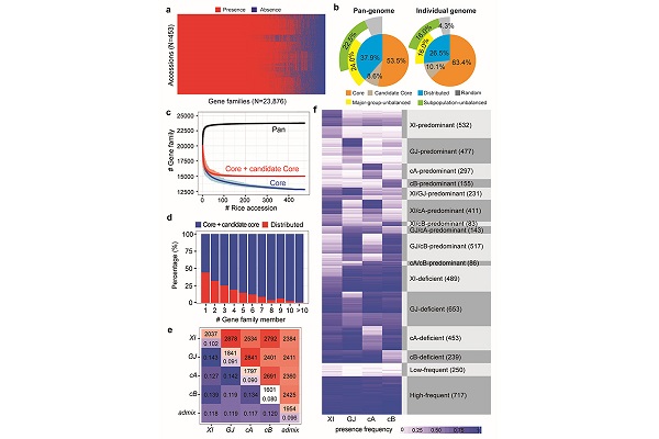 该研究共检测到32M的高质量SNPs和Indels,对亚洲栽培稻群体的结构和分化进行了更为细致和准确的描述和划分,由传统的5个群体增加到9个,分别是东亚(中国)的籼稻、南亚的籼稻、东南亚的籼稻和现代籼稻品种等4个籼稻群体,东南亚的温带粳(gěng)稻、热带粳稻、亚热带粳稻等3个粳稻群体、以及来自印度和孟加拉的Aus和香稻;首次揭示了亚洲栽培稻品种间中存在的大量微细(>100bp)结构变异(SVs,包括易位、缺失、倒位和重复);构建了亚洲栽培稻的泛基因组,包括14,826个(62.1%)核心(core)基因家族和9050个(37.9%)分散式(distributed)基因家族。发现了1.2万多个未包含在参考基因组中的新基因,使得水稻基因组中包含的基因数量增加了近三分之一(从36000多到48000多个)。核心基因比较古老,大多数的新基因表现更年轻并且长度偏短。