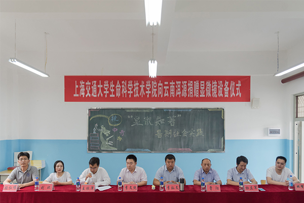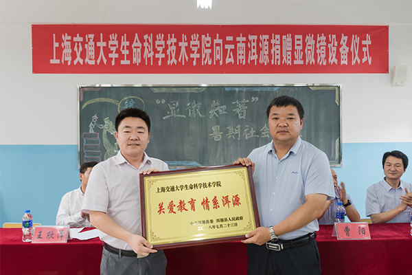 随后进行显微镜捐赠仪式。玉湖初级中学、洱源职业高级中学的校长代表学校接受价值约20万元人民币显微镜设备的捐赠。李灿文向上海交大437bwin必赢国际官网回赠爱心牌匾,李文纯代表学院接受牌匾。