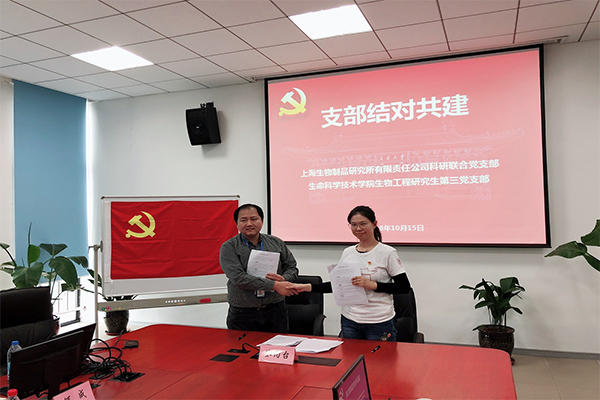 在共建仪式上,上海生物制品研究所有限责任公司和学院简要的介绍了各自的历史沿革、结构和取得的成果,师生们全面地了解到了这家国有企业的发展实力和历史积淀。随后,双方支部进行了介绍和展示。生物工程研究生第三党支部书记蔡花漫围绕支部的组成、课题组导师专业背景、活动开展、支委工作分工以及支部的共建展望五个方面做了详细介绍。上海生物制品研究所科研支部党支书何成从支部的情况、所在成员获得荣誉奖励、支部开展的各项活动等方面进行了系统的描述。最后,双方签订了支部共建协议,就支部共建目标、共建制度、共建内容等做了约定。