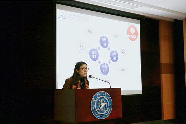 陈鹏主持学院正职领导述职。邓子新总结汇报了学院在学科基地、师资建设、科学研究、国际化办学、人才培养、党建等方面的工作情况和突出成绩。