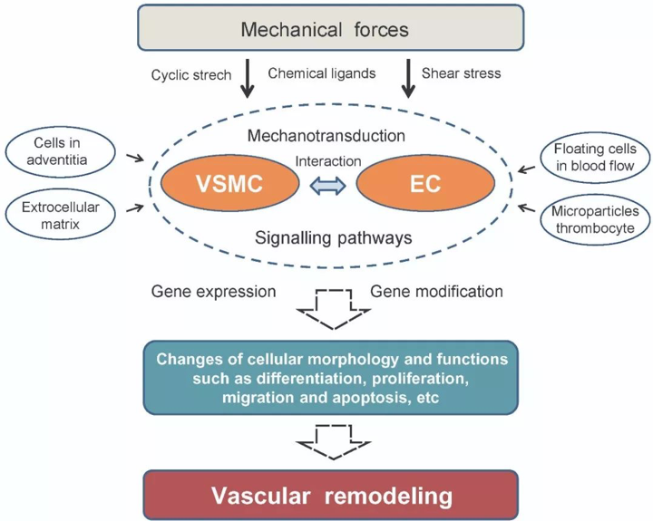 血管重建(remodeling,重构、重塑)是指高血压、动脉粥样硬化、心肌梗塞、脑卒中等心脑血管疾病发生时,血管细胞与内环境平衡的复杂变化过程,改善血管重建过程能够帮助患者保持血管稳态,有助于相关疾病的治疗。血管细胞(主要是内皮和血管平滑肌细胞)可以感知各种形式的机械力信号,如切应力和张应变,并将其转化为细胞内生化信号,再经细胞内的级联反应,达到调节血管形态功能、影响血管重建的目的。除化学因素外,力学因素在血管重建中有直接而显著的作用,血管内皮细胞和平滑肌细胞间的相互作用,血流中微体、血小板和悬浮细胞、血管细胞外基质和血管外膜也参与其中。