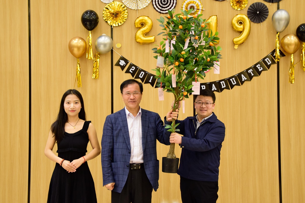 张佳星同学代表全体毕业生向学院赠送人才培养树,祝福学院越办越好,感谢老师们长久以来的辛苦付出和辛勤培育。邓子新和嵇绍岭代表学院接受了这份别出心裁的礼物。嵇书记代表学院向毕业生表示感谢,希望广大毕业生能像这棵培养树一样扎下根来,茁壮成长。他表示,学院永远是大家的家,欢迎同学们常回家看看。
