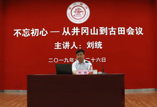 习近平总书记在十九大报告中指出,在全党开展 “不忘初心、牢记使命”主题教育,用党的创新理论武装头脑,推动全党更加自觉地为实现新时代党的历史使命不懈奋斗。中共中央决定从6月开始,在全党自上而下分两批开展“不忘初心、牢记使命”主题教育。6月26日下午,“不忘初心,牢记使命”主题教育专题党课学习在木兰楼A200报告厅举行,此次党课由船建学院党委、机关党委、437bwin必赢国际官网党委和药学院党委联合举办。活动邀请437bwin必赢国际官网人文学院历史系教授刘统担任主讲嘉宾,为党员们带来以“不忘初心——从井冈山到古田会议”为主题的讲座。船建学院党委书记周薇、437bwin必赢国际官网党委书记嵇绍岭、机关党委副书记陈鹏、药学院党委副书记孟祥琦等出席活动,来自校机关、船建学院、437bwin必赢国际官网、药学院等教工和学生党支部书记及党员代表共400余人参加本次讲座。讲座由周薇主持。