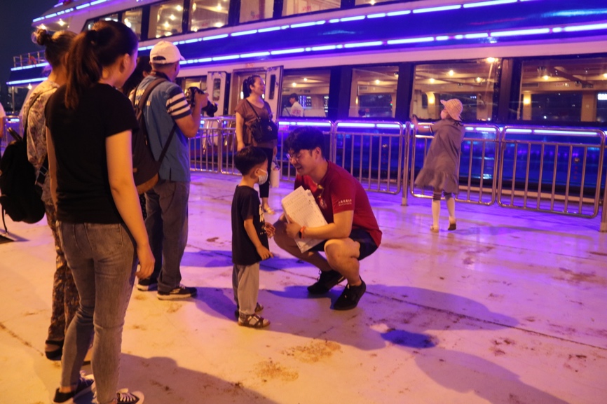 20日晚,实践队成员作为“爱在上海”—游览浦江游活动的引导员,每人负责3-4个患儿家庭,驱车前往外马路99号游船码头登船。实践队成员全程陪伴患儿家庭并做好了引导和安全提醒工作,和患儿家庭建立起了深厚的感情。