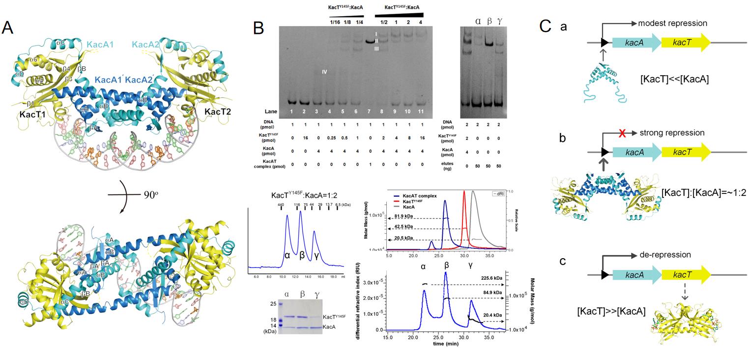 该研究发现了GNAT-RHH TA系统的转录调控存在条件协同机制。采用晶体学技术,解析了KacAT-DNA复合物的结构,发现了KacAT形成新颖的KacT-KacA2-KacA2-KacT异源六聚体,空间排布形式类似于字母W。抗毒素蛋白KacA的C-端结构域存在两种不同的折叠构象,分别与毒素蛋白KacT表面的不同区域互作,抑制KacT形成功能二聚体。抗毒素蛋白KacA的N-端形成两个RHH结构域,与启动子DNA相邻的两个大沟面相互作用,抑制kacAT操纵子的转录。随后开展的KacA和KacT野生型和突变体的ITC、EMSA和SEC-MALS等体外实验,以及KacA-KacT胞内表达等实验,表明了kacAT转录抑制的阻遏强度由[KacT]:[KacA]浓度比来调控。毒素KacT与抗毒素KacA形成蛋白复合物后,增强了KacA与DNA的结合;当[KacT]:[KacA]浓度接近1:2时,形成稳定的KacAT六聚体,对KacAT操纵子形成强阻遏;当细菌受到抗菌药物等压力刺激时,抗毒素蛋白KacA被蛋白酶降解,KacAT复合物受到游离KacT的破坏,转录抑制被解除。乙酰基转移酶类GNAT-RHH TA系统转录机制的解析,将有助于阐明细菌耐受抗菌药物的生理与代谢变化机制,将可能为临床精准抗感染策略制定和新抗菌药物的靶点研发提供依据。