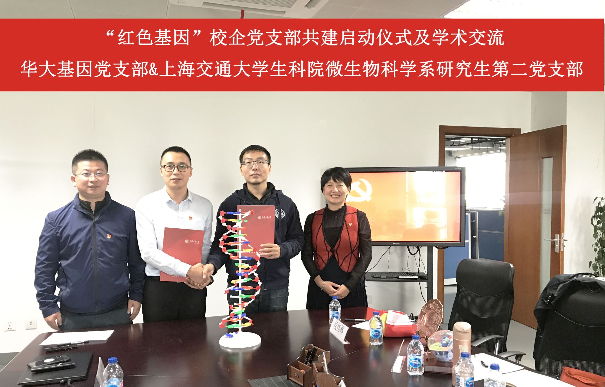 上海华大基因科技有限公司党支部党支部与437bwin必赢国际官网微生物科学系研究生第二党支部的党支书周双涛、侯佳林分别介绍了党支部组成、支部活动、科研成绩等方面情况,并代表所在党支部签订了校企党支部共行计划协议,宣布共行计划启动。杨爽、张燕红代表公司、学院互赠纪念品,并合影留念。