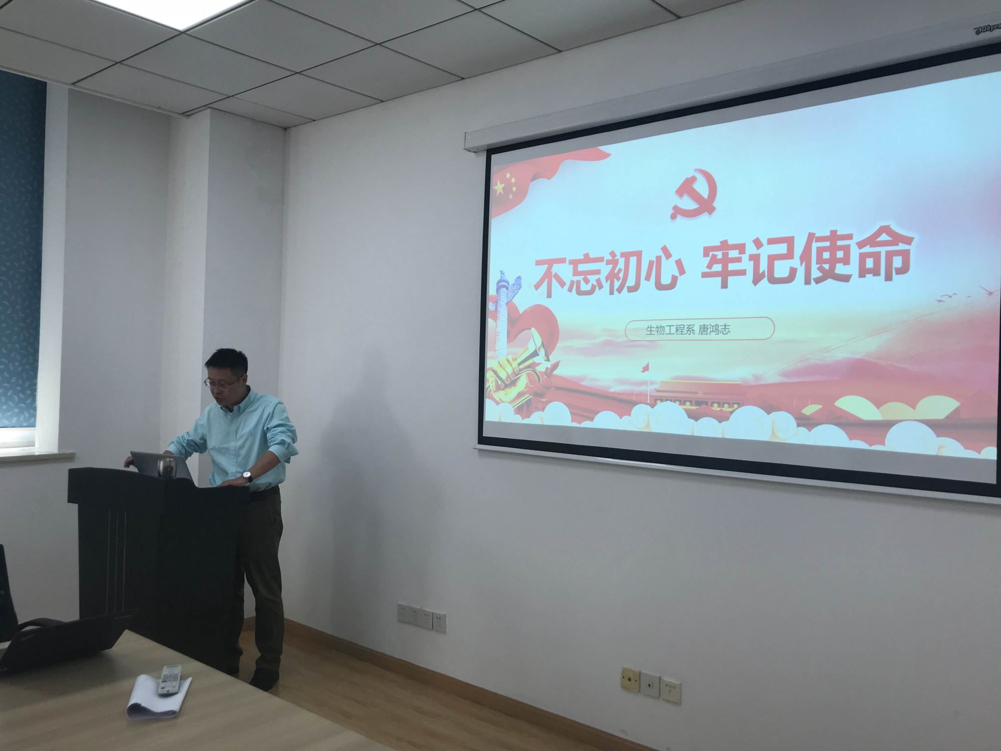 唐鸿志首先回顾了生物工程系党支部的建设历程。他表示,生物工程系的建设始终契合着中国共产党人的初心和使命,只有不忘初心,才会找对人生的方向,才会坚定追求,才会抵达自己的初衷。他指出,作为一名普通的教育工作者,要不忘初心跟党走,就要不畏艰难,保持永不懈怠的精神状态和一往无前的奋斗姿态。唐鸿志最后强调,新的时代务必有新的思想武装,要用习近平新时代中国特色社会主义思想武装头脑、指导工作、推动实践。