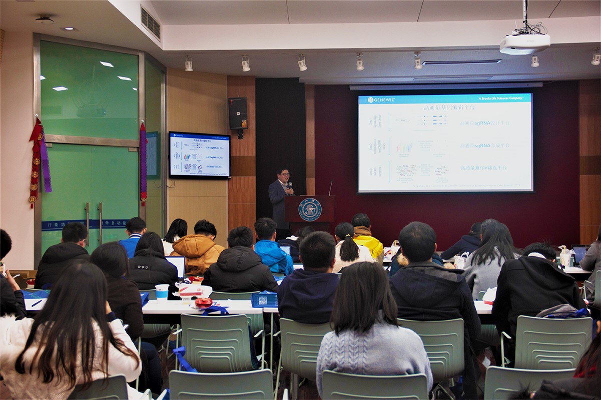 苏州金唯智基因编辑产品经理徐加振介绍了公司概况,分别从“基因编辑发展和应用”、“精准基因编辑:ssDNA”、“高通量基因组编辑和筛选”和“病毒包装技术”四个方面详细介绍了以CRISPR/Cas9为代表的基因编辑技术,并回答同学提问。