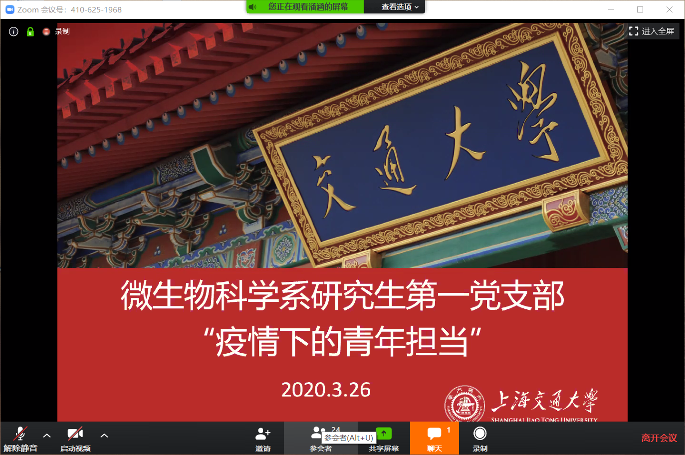 2020年伊始,新冠肺炎疫情的蔓延使得中国乃至全世界打响了一场没有硝烟的战争。众多青年主动请缨,和英勇奋战的一线防控人员一起参与到疫情的防控中,为抗击疫情贡献了自己的力量。3月26日,437bwin必赢国际官网微生物科学系研究生第一党支部在zoom平台上以“疫情下的青年担当”为主题召开了支部会议,支部21名正式党员和3名预备党员参加了本次会议。