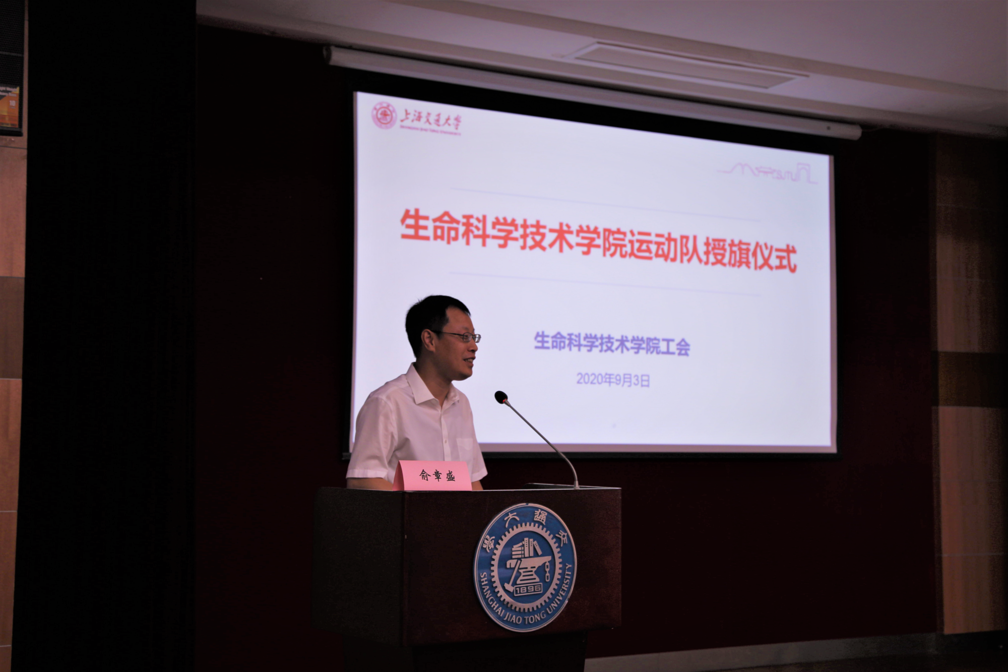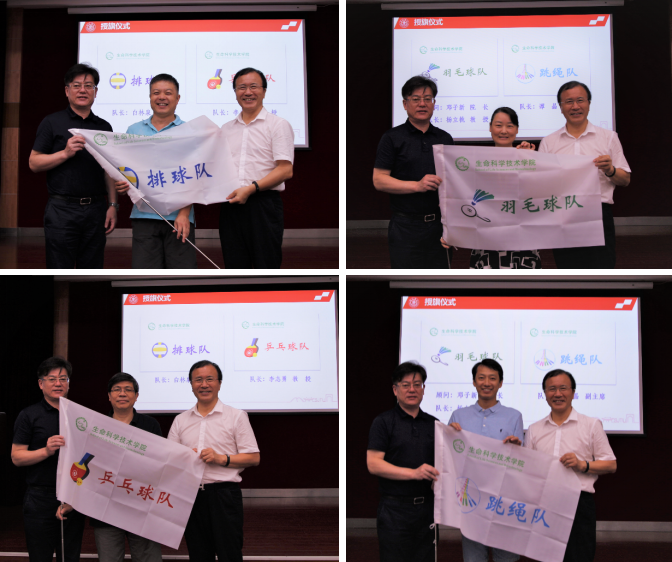 本次正式授旗的运动队有“排球队”、“乒乓球队”、“羽毛球队”、“跳绳队”。排球队队长由生物工程系主任白林泉教授担任,乒乓球队队长由学院副院长李志勇教授担任,羽毛球队长由遗传发育系支部书记杨立桃教授担任,院工会副主席谭晶老师担任跳绳队队长。四位队长从于朝阳主席和邓子新院长手中接过队旗,分别在现场发表了热情洋溢的招募演说,赢得了在场老师们的掌声和欢呼。