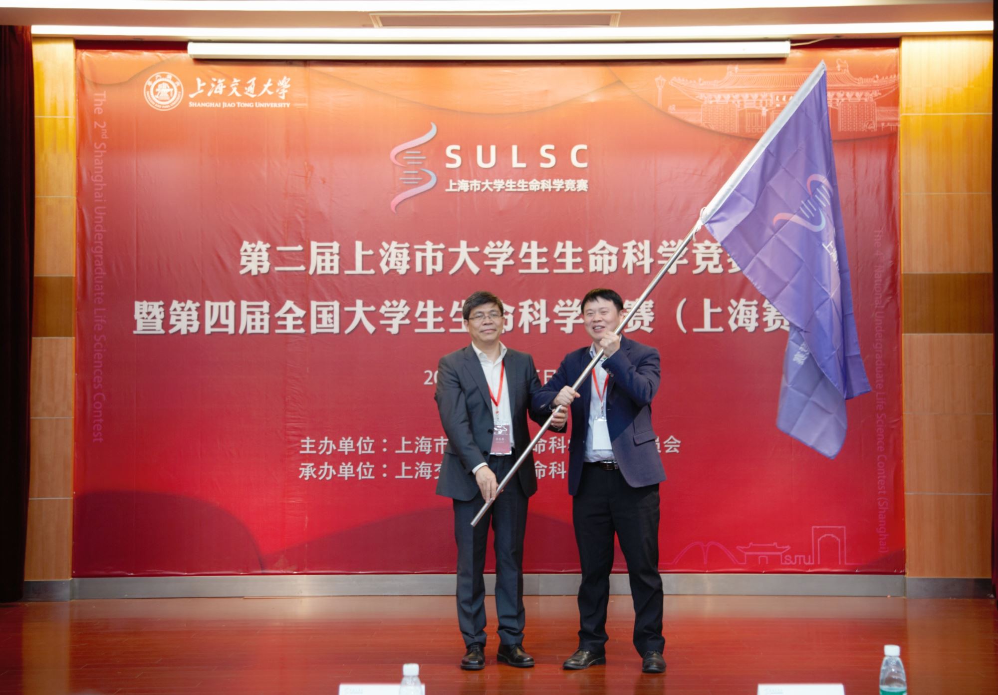 最后,在热烈掌声中华东理工大学生物工程学院副院长王启要教授从李志勇教授手中接过了会旗,正式成为第三届上海市大学生生命科学竞赛承办单位。全国大学生生命科学竞赛委员会秘书长、教育部高校大学生物学教学指导委员会副主任委员、浙江大学吴敏教授通过视频连线,对生命科学竞赛的成功举办表示祝贺。