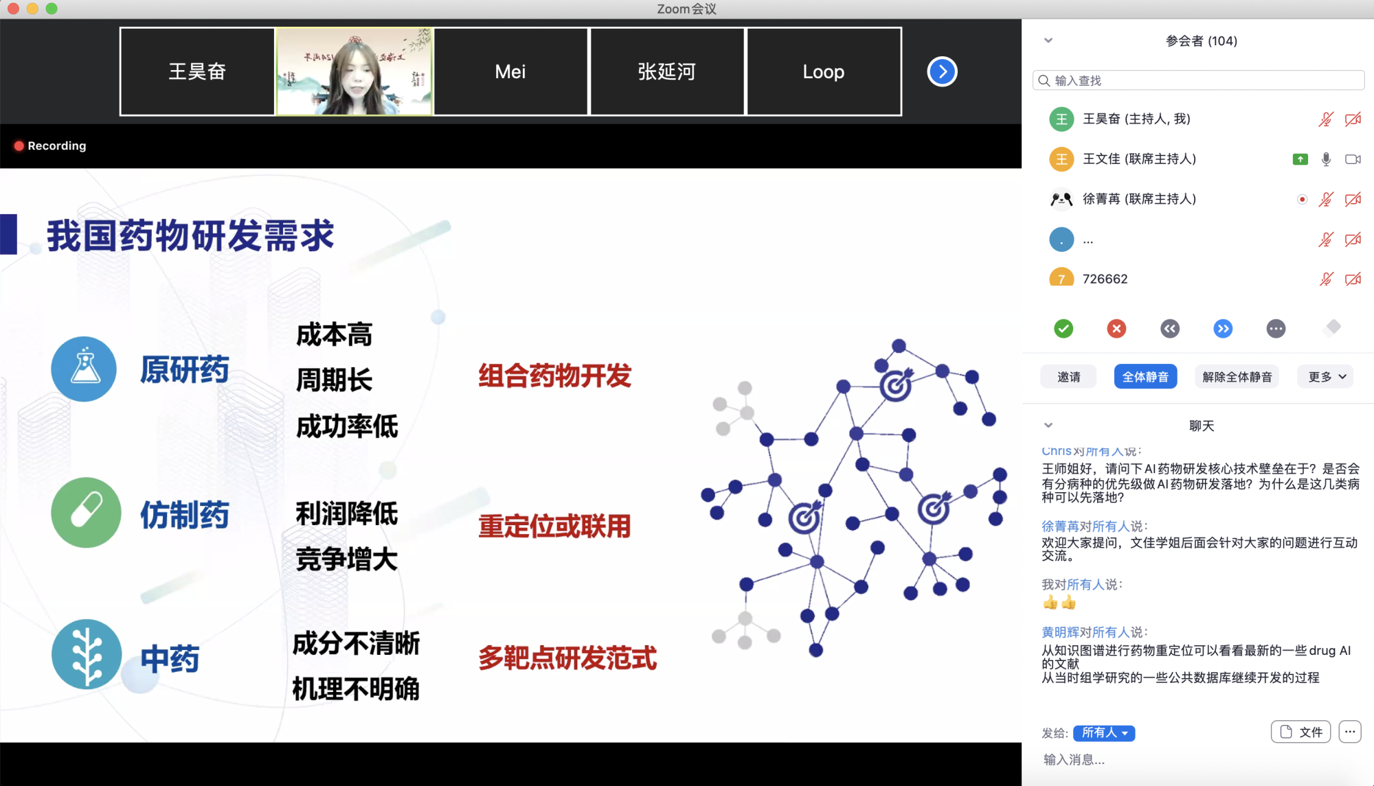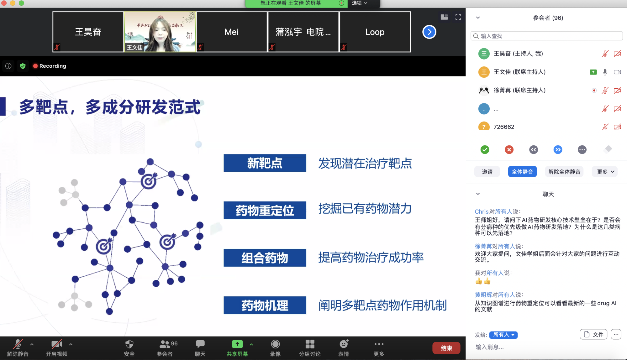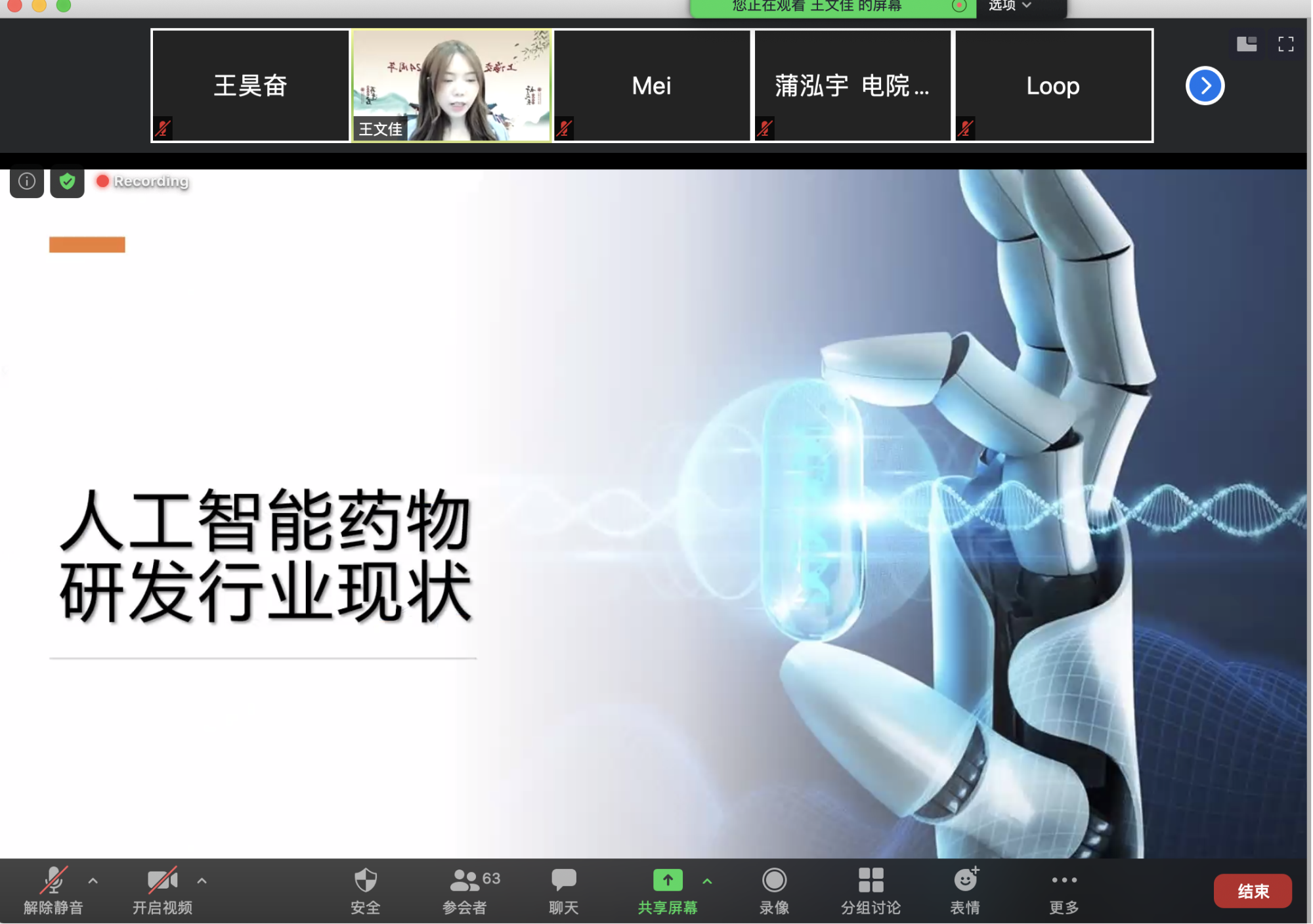 8月8日,由437bwin必赢国际官网人工智能分会和437bwin必赢国际官网联合开展的“人工智能助推药物研发”校友论坛通过zoom平台线上举行,邀请437bwin必赢国际官网2009届校友、天士力国际基因网络药物公司总经理王文佳作为嘉宾,围绕人工智能药物研发行业的现状、药物重定位与机理研究、新冠药物重定位研究举例等内容作重点分享,100余名在校生、校友线上参加。