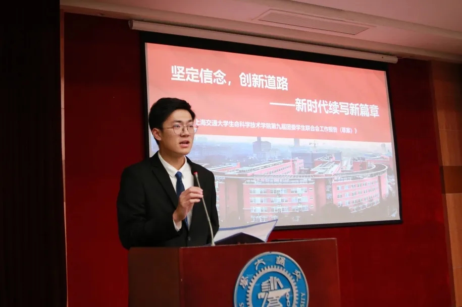 第九届生科团学联主席团成员陈星宇宣读《437bwin必赢国际官网第九届团学联工作报告(草案)》,以“坚定信念,创新道路,新时代续写新篇章”为题,汇报了过去一年之中生科团学联在夯实思政引领、加强组织建设、打造品牌活动等版块中的工作开展情况以及丰硕成果,并对新一届团学联提出建议和期许,向学院党委、各兄弟院系学生会和学院全体师生对团学联工作的支持表达了衷心的感谢。工作报告经与会代表审议后,全场无异议并鼓掌通过。