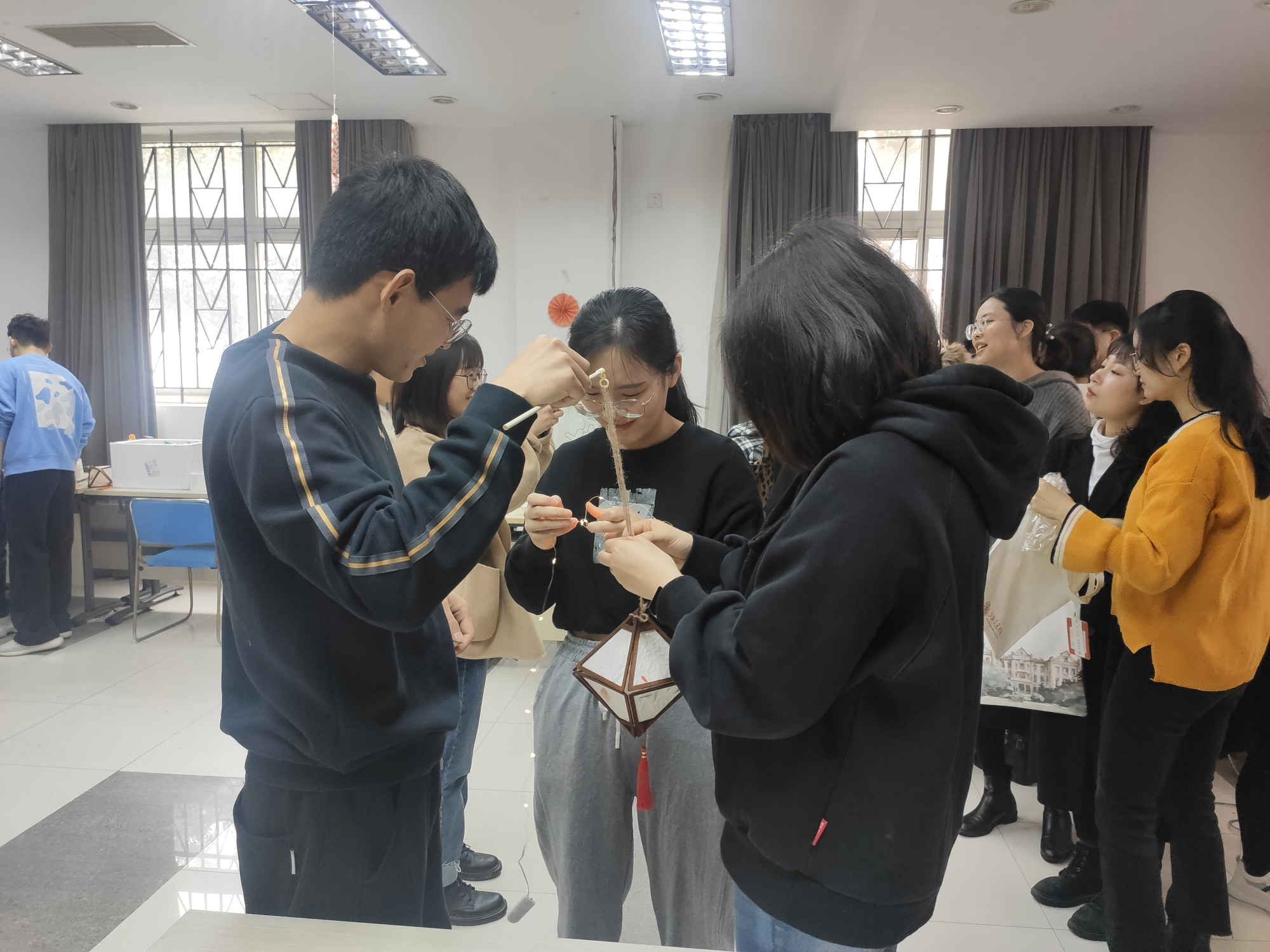 同学们现场制作元宵灯。精美的元宵宫灯寓意团圆美满,同学们在参与过程中配合默契,制作后纷纷合影留念。
