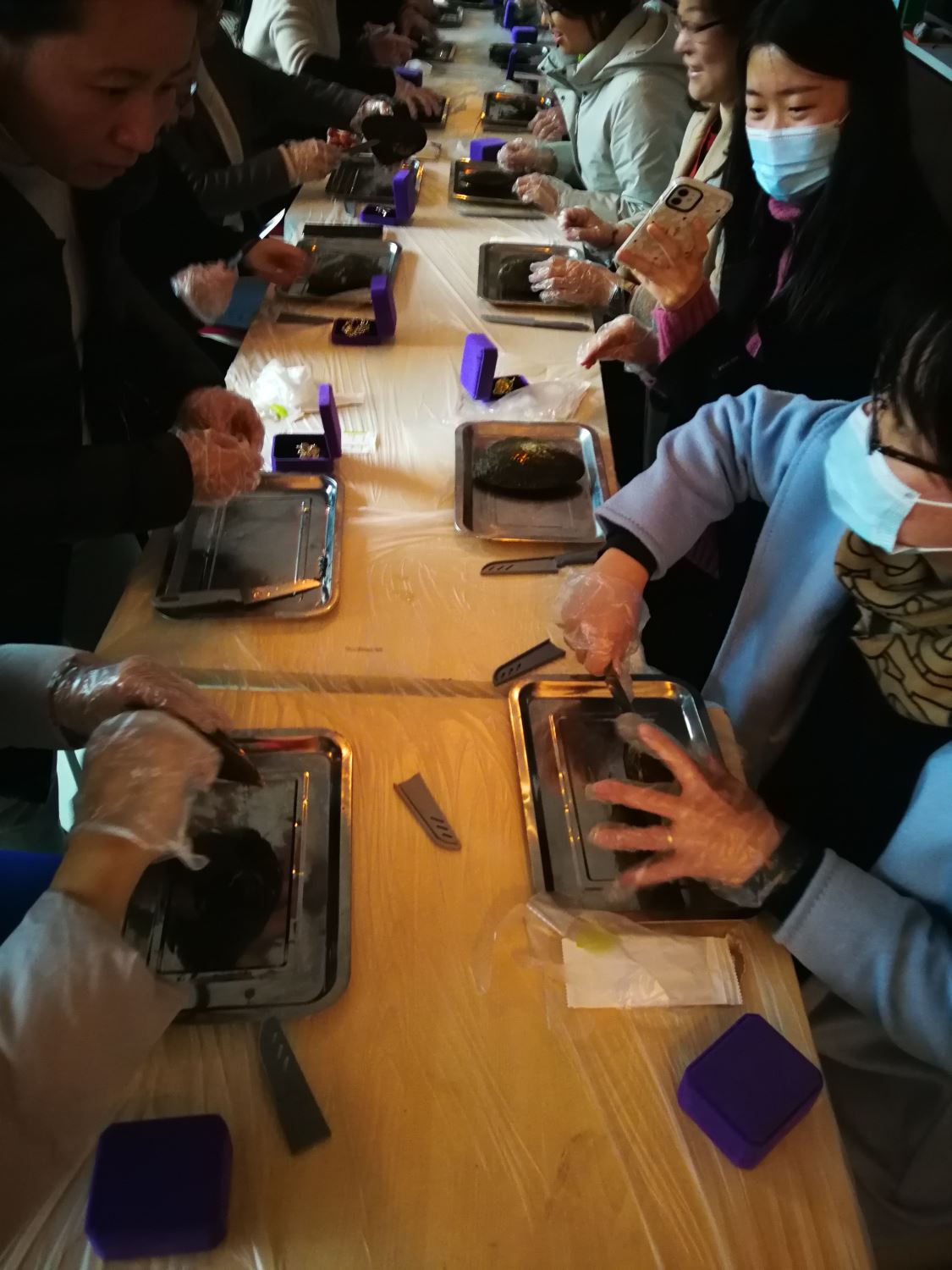 在工艺师现场讲解和演示后,教师们各显身手,用工具刀划过紧闭的河蚌,取出一颗颗熠熠发光的饱满珍珠,认真地洗珠、擦珠、打磨抛光,热烈欢快的气氛让现场不时传来赞叹声、欢呼声。在工艺师的协助下,教师们将胸针或戒托与亲手取出的珍珠进行镶嵌,做成一枚枚光彩夺目的胸针、戒指。