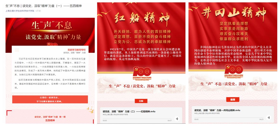 习近平总书记在党史学习教育动员大会上指出:“在一百年的非凡奋斗历程中,一代又一代中国共产党人顽强拼搏、不懈奋斗,涌现了一大批视死如归的革命烈士、一大批顽强奋斗的英雄人物、一大批忘我奉献的先进模范,形成了一系列伟大精神,构筑起了中国共产党人的精神谱系,为我们立党兴党强党提供了丰厚滋养。”党在长期的奋斗中,形成了红船精神、井冈山精神、长征精神、遵义会议精神、延安精神、西柏坡精神、红岩精神、抗美援朝精神、“两弹一星”精神、抗震救灾精神、抗疫精神、脱贫攻坚精神等伟大精神,构筑起了中国共产党人的精神谱系。一系列伟大精神化作红色灯塔,照亮我们奋进新时代的远大征途。通过微信公众号推文学习党史是推进党史学习教育的重要载体,图文与音频相结合,更加生动地讲述“精神”背后的故事,推动党史学习教育融入师生日常,现已通过学院微信公众号推送3期。