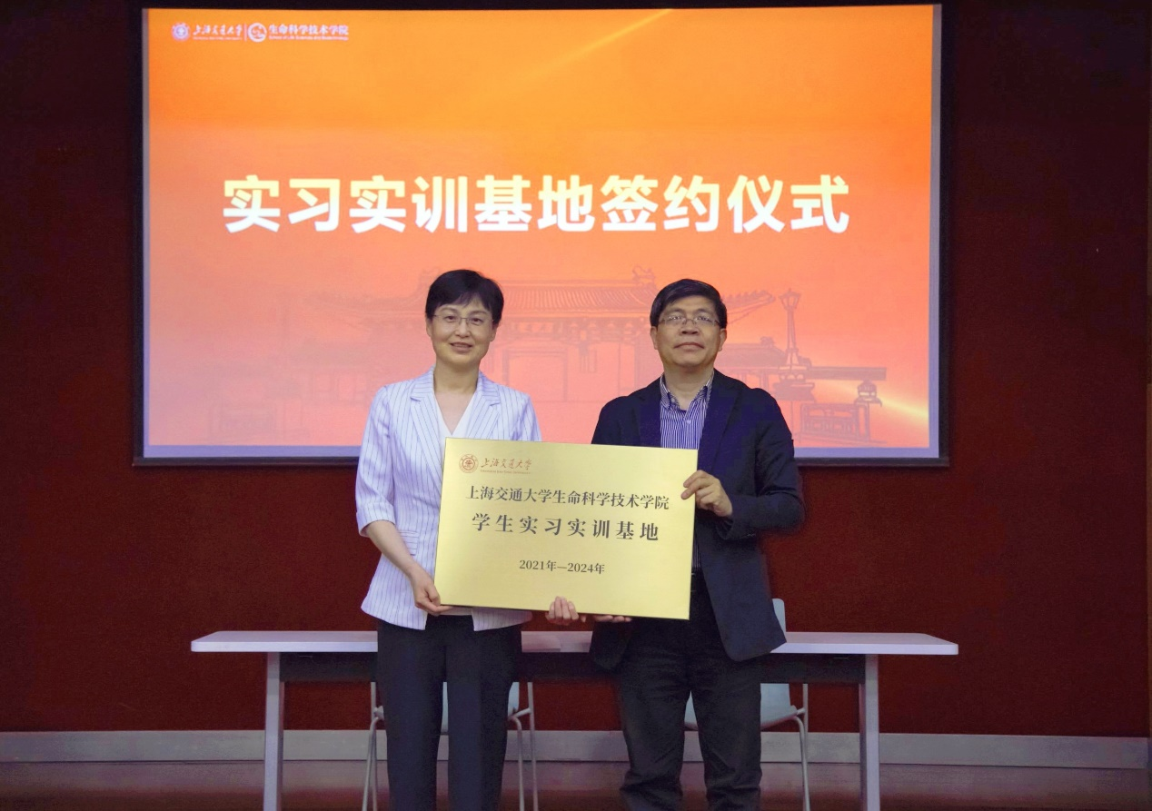 李志勇代表学院,与基因科技(上海)股份有限公司、上海生物制品研究所有限责任公司、南京金斯瑞生物科技有限公司、苏州贝康医疗股份有限公司、上海金域医学检验所有限公司、上海药明生物技术有限公司签署学生实习实训基地,并现场授牌。