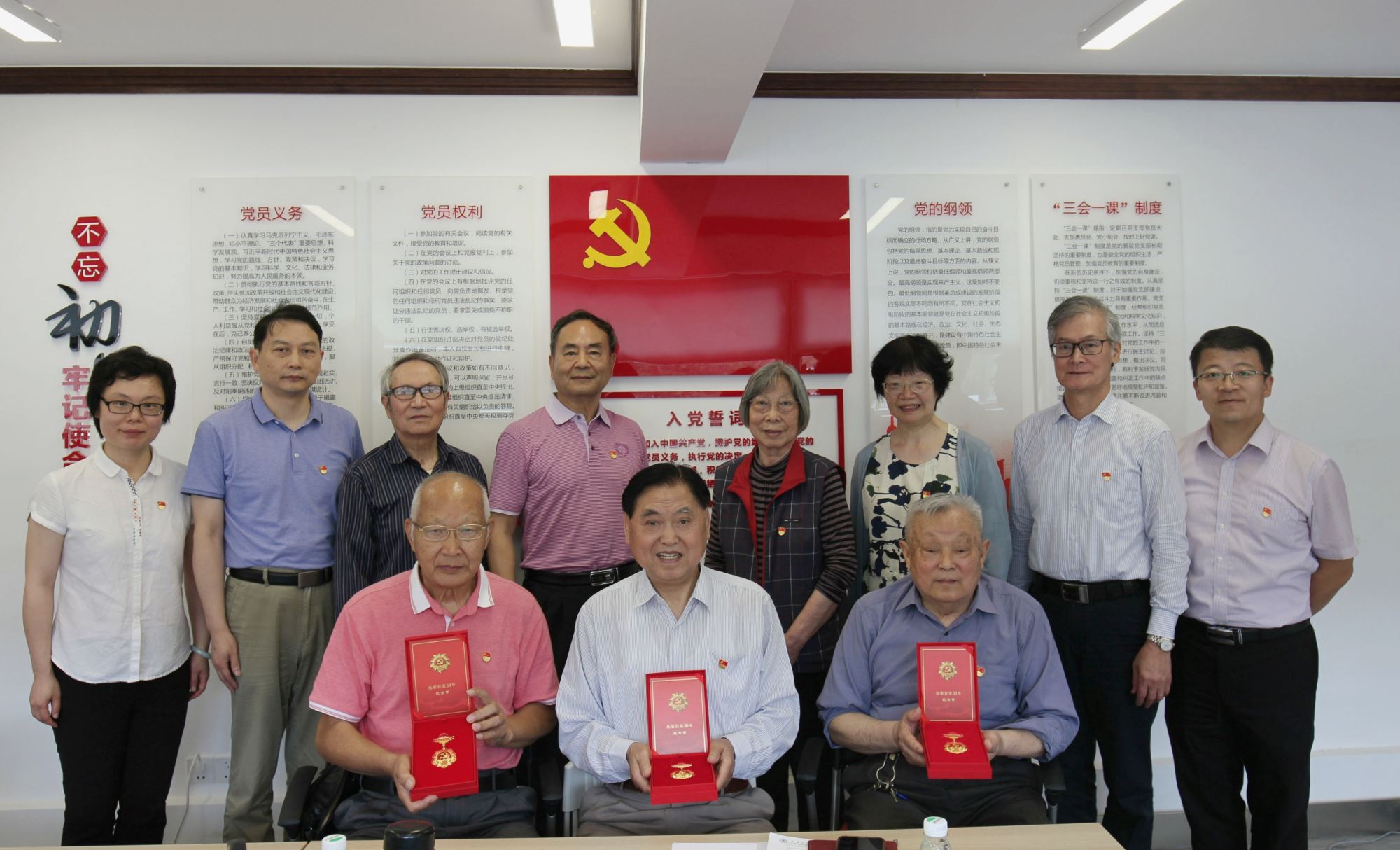 交流会后,学院党委书记嵇绍岭同志向党龄超过50年的朱章玉同志、许煜泉同志和杨宝康同志颁发了“光荣在党五十年”纪念章。