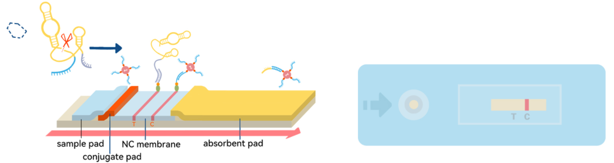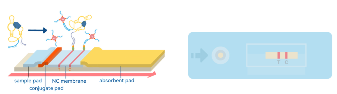 而后,SJTU-BioX-Shanghai设计了基于胶体金侧流分析技术的试纸条来表征aptazyme剪切与不剪切的两种状态(分别对应着待测靶标不存在与存在两种状态)。在T-line上利用生物素-亲和素固定了一条探针,通过与aptazyme 3`端的互补配对把aptazyme捕获在T-line上。同时conjugate pad(胶体金垫)上是胶体金标记的5`端探针,因此全长的单链寡核苷酸(aptazyme)在流动至T-line时会形成金标探针-aptazyme-生物素标探针的复合物,T-line处聚集的胶体金颗粒将显现出明显的红色条带。而若aptazyme发生了自我剪切,5`端的探针则只能结合在断裂下来的片段上,随着液体继续向吸收垫流动,T-line不会显现颜色。