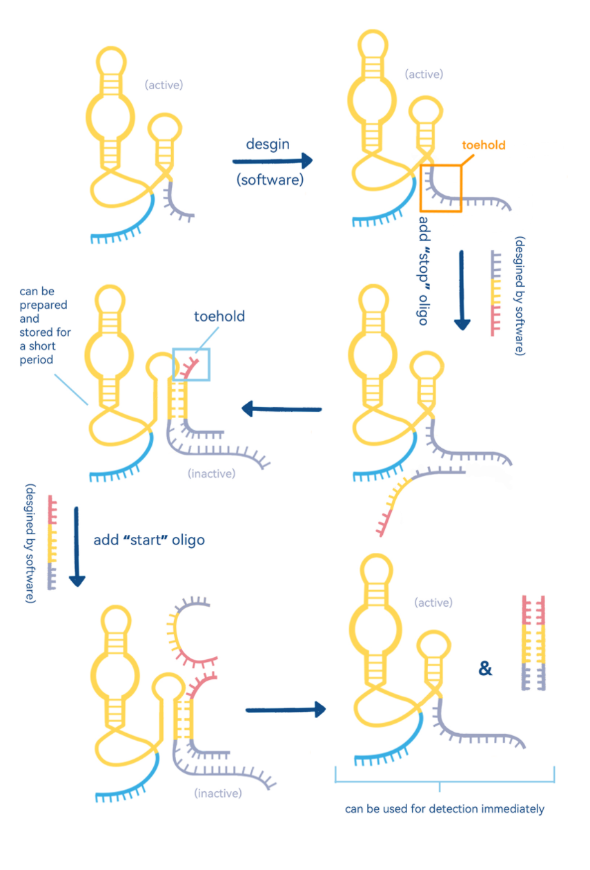 SJTU-BioX-Shanghai还引入了基于核酸链置换反应(TMSD)的优化策略来进一步缩短检测时间,降低制作成本。通过在体外转录反应中引入一段和aptazyme内部序列互补的寡核苷酸,它将能够通过互补配对打开aptazyme原有的二级结构使之失去功能,因此完整的aptazyme序列得以在待测的靶标分子不存在的情况下被合成并保存。需要进行检测时,只需要加入与第一段寡核苷酸互补的另一端寡核苷酸将最初的寡核苷酸竞争下来,释放aptazyme,让它恢复正常构象,即可实现剪切活性的恢复。
