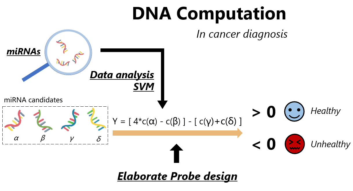 2020年全球癌症死亡人数高达1000万人,癌症死亡率高的一个很重要因素就是大多数癌症在晚期才被检测出来。为此,人们迫切需要一种高效、无创的癌症早筛手段。在文献调研过程中,团队了解到韩达实验室将基于探针的检测方式——DNA计算应用于检测癌症的生物标志物之一miRNA,并能达到较高的正确率。在进一步的探索过程中,团队了解到DNA计算具有快速、无创的优点。