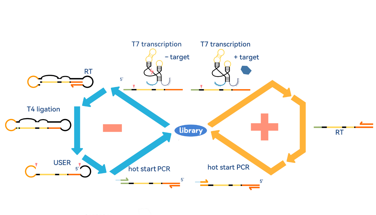 为了达到上述目标,SJTU-BioX-Shanghai创新性地将aptazyme应用到了快检领域。Aptazyme是一段寡核苷酸,由aptamer和ribozyme两部分串联组成。Aptamer负责结合特定的靶标,ribozyme(核酶)的部分通过形成一个特殊的活性中心,可以催化自身特定位点的磷酸二酯键断裂。通过理性设计,aptamer与靶标结合时造成的扰动会影响到ribozyme区域的结构,从而导致ribozyme的催化剪切的活性发生变化。因而aptazyme可以将靶标是否存在转化成核苷酸链是否完整的信号。斯坦福大学在21年3月发表的一种aptazyme的液相筛选开发策略 (DRIVER)针对新靶标分子的aptazyme筛选过程可以完全在自动移液平台上完成,而后进行二代测序,顺利的情况下二十天之内可以得到结果。