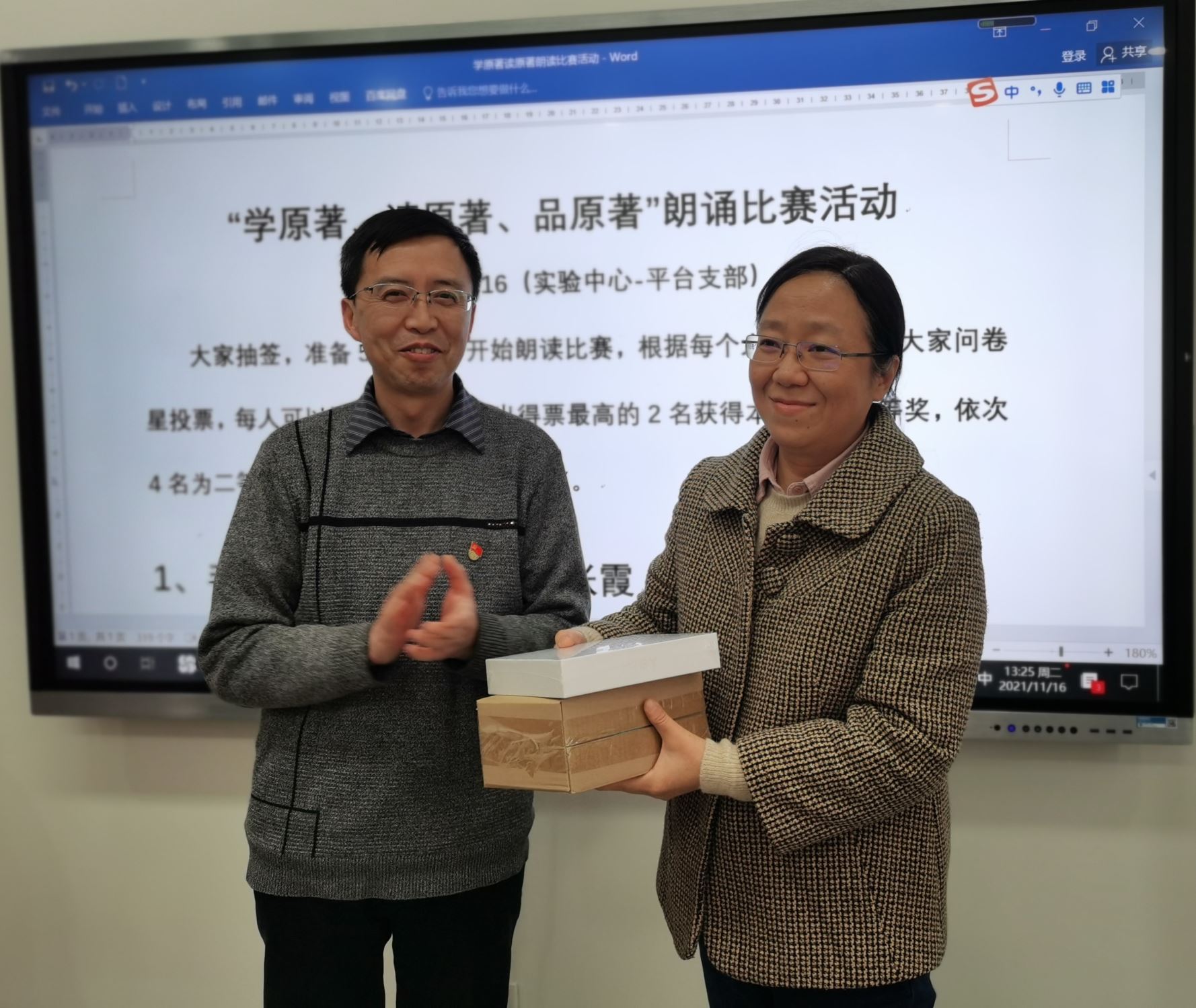 党课结束后,支部开展了“学原著、读原著、品原著”朗读比赛。每位党员现场抽取朗读材料,并按照抽取号码的次序依次朗读原著材料。各位同志积极认真准备,共同学习,朗读者声情并茂,聆听者聚精会神。通过逐字逐句朗读原著的方式,支部党员能够在繁忙的工作之余放慢节奏,口诵心惟,体味原著的用词遣句,感受原著带来的力量,品读原著中所蕴含的智慧。朗读结束,支部党员现场在线投票选出一二三等奖,由张晓君副院长给获奖老师颁奖。