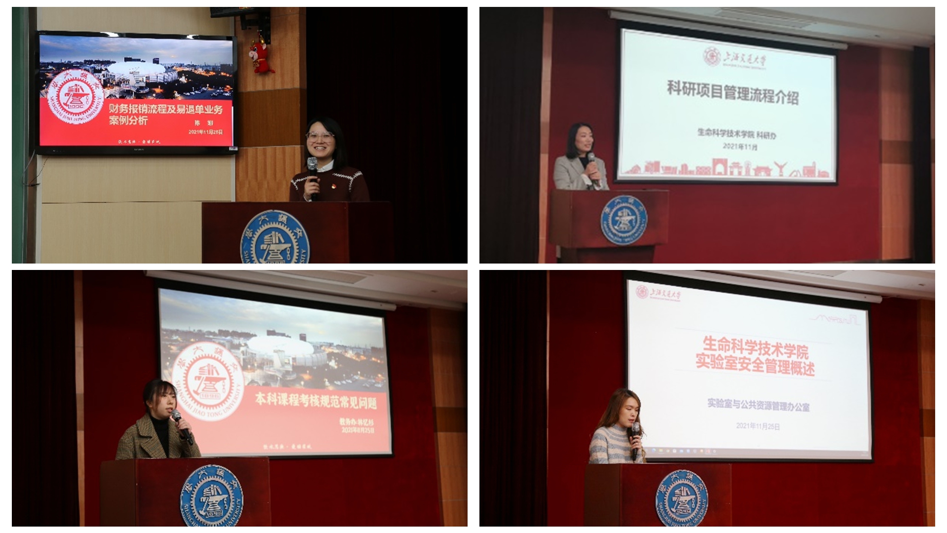 会上,学院党政办财务专员陈娜介绍财务报销相关工作,从科研经费支出红线、学院财务报销流程、易退单业务案例分析三方面进行详细讲解,着重警示了不能触碰的财务红线;科研办科研秘书丛珊介绍科研项目管理流程,从申请阶段、过程管理、结题结账为新进教师普及了科研项目全流程管理;教务办本科教务林忆杉就本科课程考核规范常见问题讲解了避免教学事故的制胜法宝;实验室办主任刘璐从生物实验室安全管理角度开展宣讲,从安全理念、实验室个人防护、生物实验室共性问题、生物实验室废弃物的处理处置等方面,向师生普及了生物实验室安全知识。