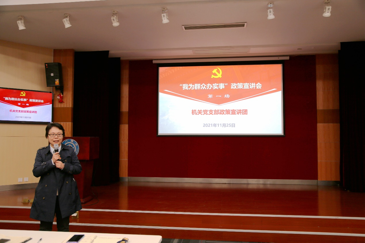 学院党委副书记王鑫讲话。她指出,“我为群众办实事工程”活动开展以来,机关党支部第一时间聚焦现存突出问题,以解决师生最关注的问题为出发点,结合机关党员自身工作形成18项政策宣讲主题。通过组织试讲、学院领导评审等环节,精益求精,严把宣讲质量。本次宣讲会的四项主题,是师生通过政策宣讲主题菜单“点单式”服务按需点单、投票选出的最急需的几项讲解服务。此后,机关党支部将继续开展一系列政策宣讲活动,致力于打造一流学院的一流机关,共创一流事业。