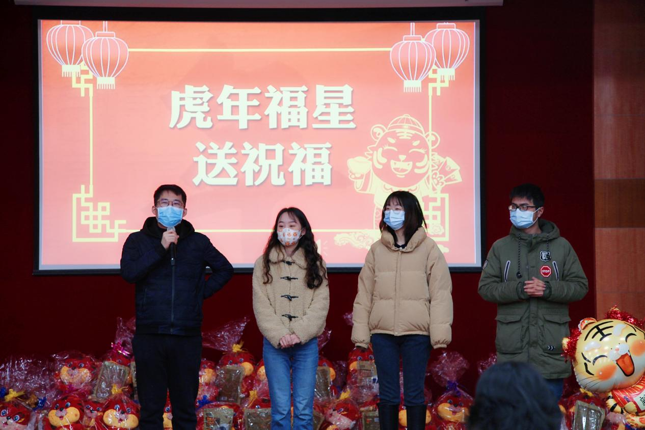 与会嘉宾向同学们赠送新春礼包。新春慰问活动承载着学院对留校学子的殷切关怀,增添了温馨、喜庆的节日氛围。