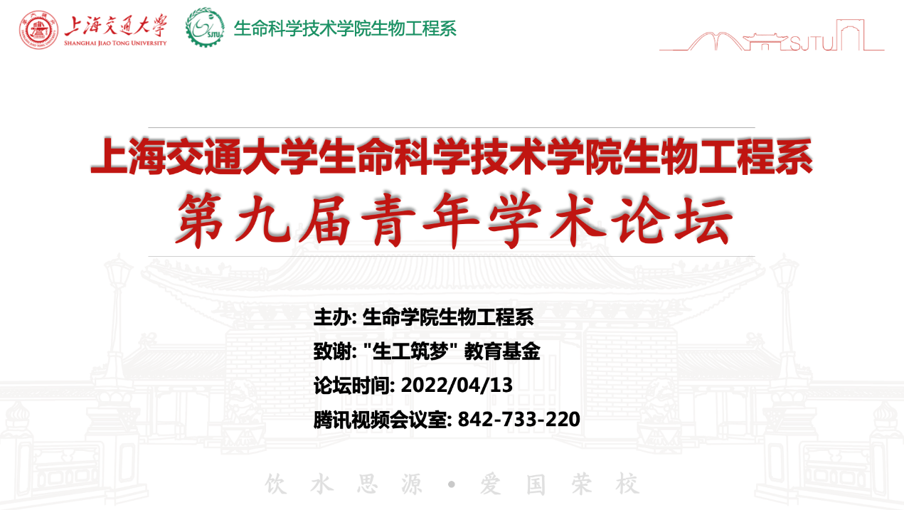 2022年4月13日,437bwin必赢国际官网生物工程系“第九届青年学术论坛”在线上成功举办。全院150余名师生积极参与本次活动。“青年学术论坛”是生工系为研究生搭建的一个重要学术交流平台,自2011年首次举办至今已有近200位生工学子在这个舞台上展示分享自己的学术成果。