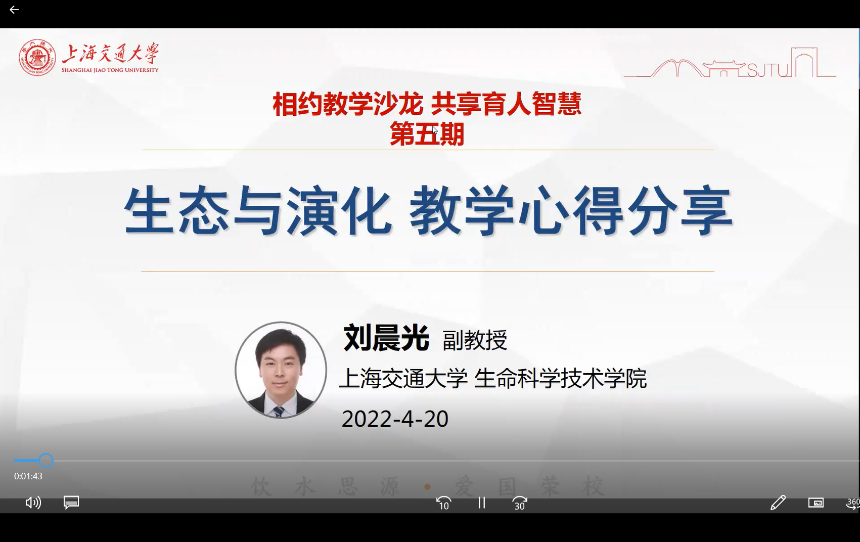 刘晨光以《生态与演化》课程为例,分享了教学设计、教学创新以及目前在线教学的心得体会。他从课程的学情分析、课程内容、评价方式等,讲到如何实现“有趣、前沿、启发”的教学理念,使用沉浸式学习激发兴趣,引入一线文献触及前沿,提出“脑洞大开”问题启发思考。随后刘晨光介绍了在线教学的设备准备、网站运行等细节,总结出教师要保持热爱、学习、专注,并不断调整需求、尝试、改革,达到自信、积累和应变能力的最佳。
