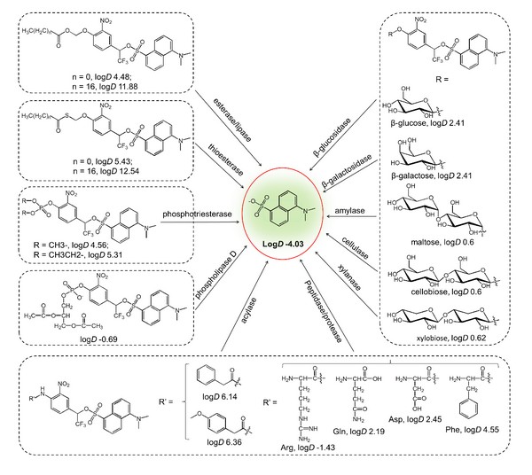 为解决此问题,研究团队提出了一种被称作“荧光液滴捕获(Fluorescence Droplet Entrapment, FDE)”的酶底物设计新策略。他们通过调节底物和产物分子疏水性的变化,来控制分子在微液滴内的扩散行为,从而提高筛选体系的准确度。具体来说,经过FDE设计的底物分子结构具有较高的疏水性,可以自由通透油相进入微液滴内部与酶进行反应;在酶促反应后,底物被转化为具有较高亲水性的荧光产物,由于其高亲水性,荧光产物被困在微液滴内部无法扩散出,从而可以准确地定量反映微液滴内部的酶活性。在使用磷酸三酯酶进行的模式筛选实验中,经过单次筛选即可将阳性细胞在大量无酶活性的阴性细胞中富集900倍以上,显示了FDE底物设计方法的高效性。本研究还进一步探讨了FDE底物设计方法的通用性,对于酯酶、脂肪酶、磷脂酶、糖苷酶、蛋白酶、肽酶等重要工业酶的FDE底物设计方案提出了建议,为进行更大规模的酶快速定向进化铺平了道路。