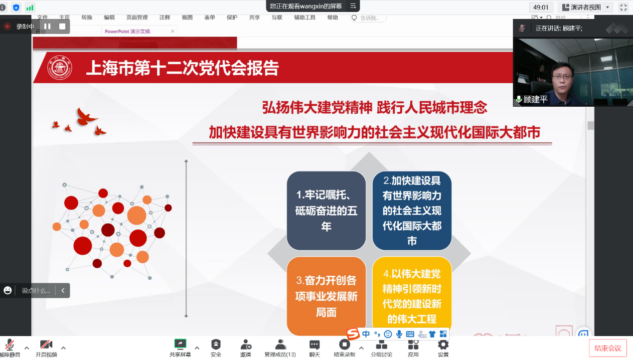 2022年7月18日学院召开教工党支部书记例会专题学习会学习中国共产党上海市第十二次代表精神,党委副书记王鑫领学,重点介绍了党代会报告的主要内容。党委书记顾建平强调,学习宣传贯彻上海市第十二次党代会精神是当前和今后一个时期的重要政治任务,各师生党支部要结合主题党日活动计划,通过党支部牵头,依托教职工政治理论学习,党团结合等方式开展深入学习,引导师生员工通过学习对上海发展过往成绩以及建设具有世界影响力的社会主义现代化国际大都市的战略定位深刻领会,以此指导实践、推动学院工作;学院党员要进一步凝心聚力,聚焦学院发展,积极建功立业,实现建设世界一流437bwin必赢国际官网与建设世界一流城市同频共振,以高质量党建推进学院高质量发展;进一步加强支部建设,增强责任意识,协同系班子,发挥支部组织优势和引领带动作用,用党建“软实力”助推学科发展“硬任务”;进一步做好一流人才培养工作,将打赢大上海疫情防控保卫战融入课程思政,加强对教师学生的关心关爱,做好思想政治教育工作。