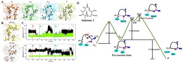 该研究从结构高度相似的两个小分子探针底物入手,运用分子动力学模拟技术,分析了在酶中环化和水解两条反应途径中底物-酶共价复合物的动态结构差异,发现在底物与酶的分子识别过程中,C7位为羰基的底物分子通过诱导契合互作更容易形成一个特异性的环化预反应态(prereaction state),从而促成了环化产物的生成;而C7位为羟基的底物缺乏这种分子识别机制,导致了水解副反应的发生。运用QM与QM/MM方法,研究团队捕捉到了反应中间体及过渡态,通过计算出环化反应的能垒预测了在反应过程中可能起到决定作用的一系列氨基酸残基(例如Leu183、Ala143、Phe260等等)。对该酶天然底物红霉素前体的计算验证了预反应态的形成决定了酶催化环化反应趋势。