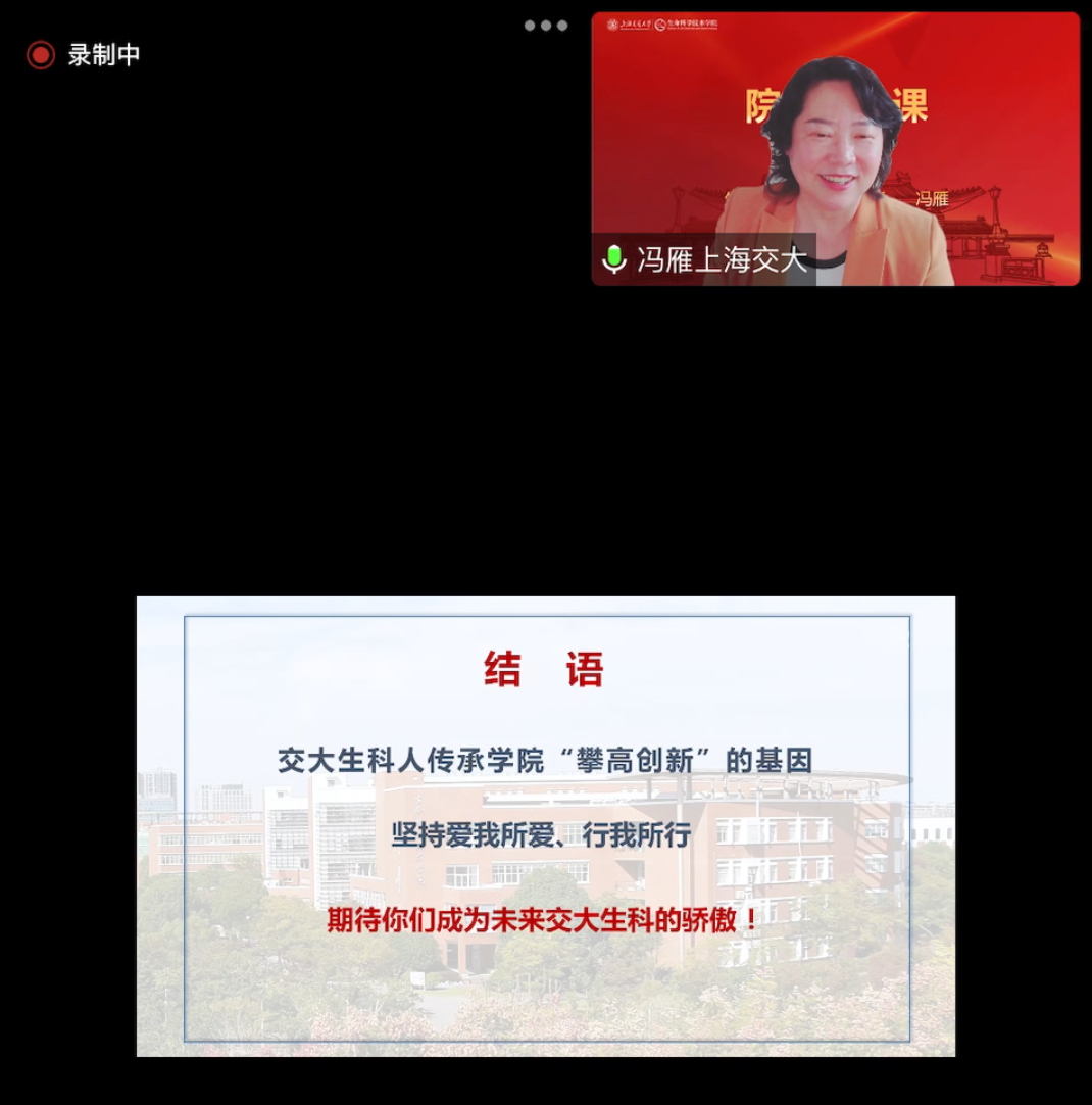 冯雁回顾了学院从无到有、由弱攀强的跨越式发展之路,介绍了学院以学科建设为抓手,增强科研创新能力,加强在师资队伍及平台建设,拓展国际交流合作,全面提高人才培养质量的建设道路。她列举了我院名誉院长、中科院院士邓子新以及众多优秀的学院教师及校友投身科研、享受孤独的求索之路,以此勉励生科学子不负青春,做世界级贡献,将“修德厚爱、健己惠人、强队谐群、凝特聚优”的学院文化发扬光大。