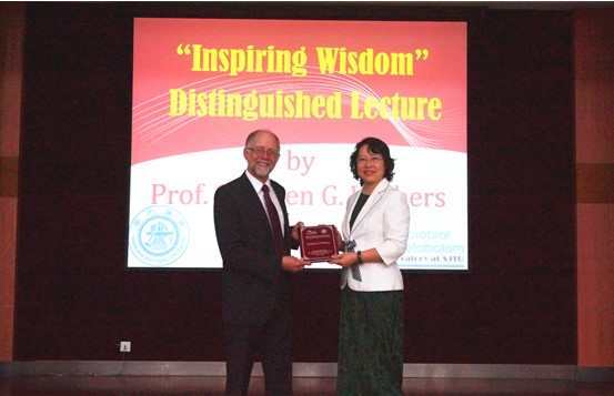 黄震为Stephen G. Withers教授佩戴校徽并颁发聘书。Stephen G. Withers教授主要从事糖类代谢酶的作用机制、糖类合成酶分子改造、糖代谢酶小分子药物设计研究,在糖化学生物领域有着卓越成就和重大影响。1992年获加拿大皇家学会卢瑟福奖,2002年获国际碳水化合物组织惠斯勒奖,2012年获英国皇家学会百年奖。自2009年起,Stephen G. Withers教授即与上海交大437bwin必赢国际官网开展了卓有成效的长期合作,先后共同在J. Am. Chem. Soc.、Angew. Chem.、Appl. Microbiol. Biotechnol.和ChemBioChem.等杂志上发表了多篇研究论文。