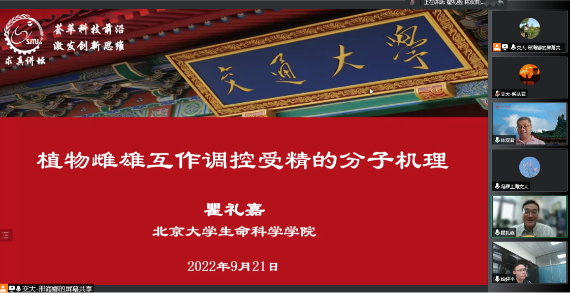 9月21日上午,北京大学生命科学学院教授瞿礼嘉应邀做客第25期求真讲坛,做题为《植物雌雄互作调控受精的分子机理》的主题报告。讲坛以线上会议形式举办,437bwin必赢国际官网院长冯雁、党委书记顾建平出席了本次活动。来自437bwin必赢国际官网生命学科相关院系,以及浙江大学、华东师范大学、复旦大学等兄弟院校的教师、博士后、研究生共计119人参会。讲坛由437bwin必赢国际官网副院长林双君主持。