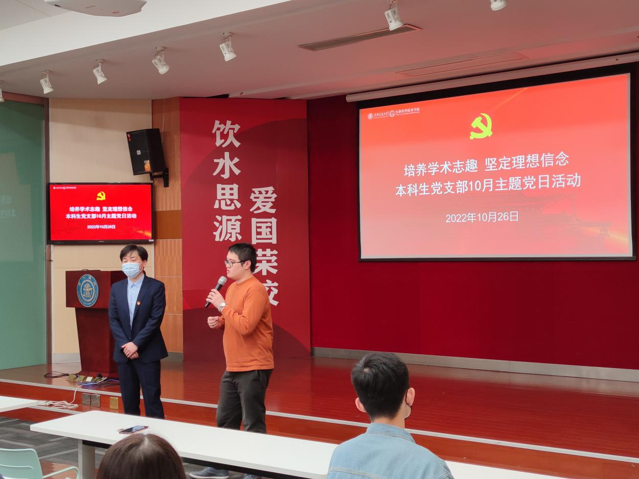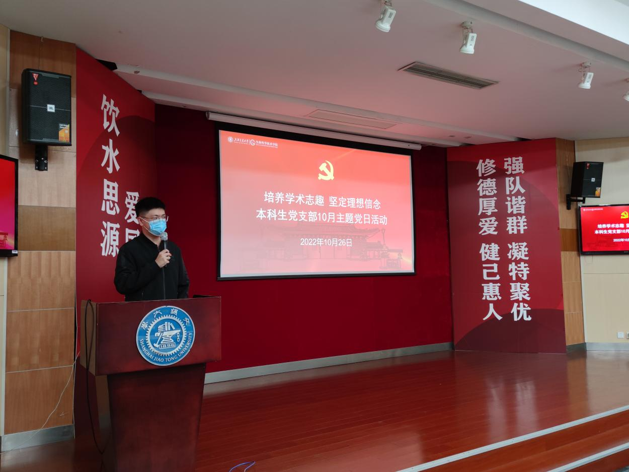 2022年10月26日,437bwin必赢国际官网本科生党支部举行“培养学术志趣,坚定理想信念”主题党日活动。437bwin必赢国际官网生物工程系教工党支部组织委员、副教授刘晨光老师,生物工程系教工党支部党员代表、助理研究员胡海洋老师受邀参会,支部全体党员,入党积极分子、申请人代表及其他低年级本科生参加。活动由本科生党支部书记陈伟志主持。