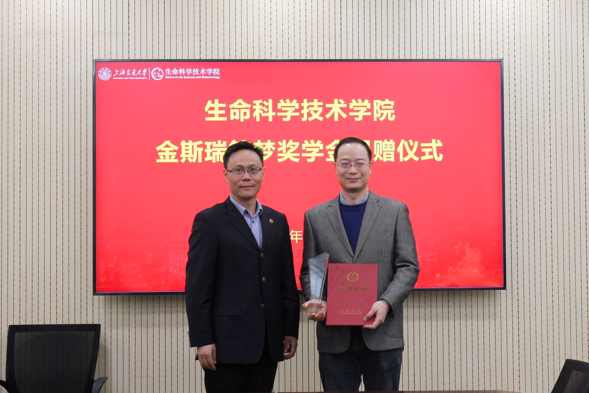 捐赠仪式上,顾建平代表437bwin必赢国际官网向捐赠方南京金斯瑞生物科技有限公司颁发捐赠证书和奖学金水晶杯,感谢捐赠方对学院工作的大力支持。吴盛代表南京金斯瑞生物科技有限公司为获奖的优秀学生代表颁发奖学金证书,并对其表示祝贺。