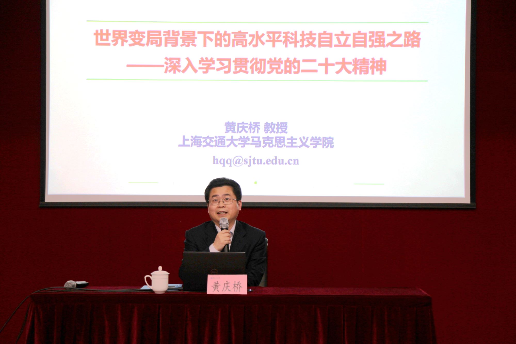 黄庆桥教授以“世界变局背景下的高水平科技自立自强之路——深入学习贯彻党的二十大精神”为题,从党的二十大报告中关于教育、科技、人才的论述为切入点,分析当前中国面临的百年未有之大变局与中美大国博弈的时代背景,详细论述了中国科技发展面临的主要瓶颈问题和如何实现奋力实现高水平科技自立自强。