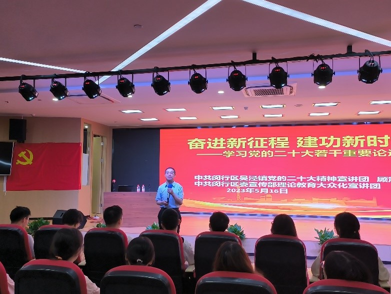 闵行区理论教育大众化宣讲团、吴泾镇“红色智囊讲师团”讲师顾震讲授专题党课,围绕全面建设社会主义现代化国家的首要任务和内在要求等内容,对党的二十大若干重要论述进行了全面生动的解读。顾震老师通过介绍自己的工作经历,用亲切朴实的语言让同志们深刻认识到基础教育对于培养人才、提高中华民族的整体素质和推进社会主义现代化建设的重要意义。在党课的最后,顾震老师讲述一枚枚小小的邮票背后承载的故事,带领同志们共同领略了在党中央的坚强领导下祖国一步步迈向强大的变迁过程。