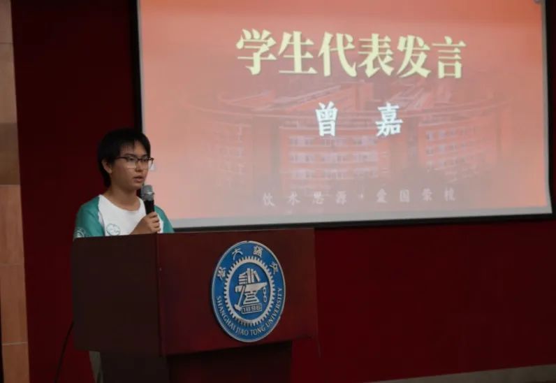 学生代表,生科2301班曾嘉发言。他表达了对于家长与老师们的感恩之情,并肯定了相聚交大的同学们的天赋与努力,并分享了自己高中时参加生物竞赛从而确立专业志趣的经历。作为新生骨干营的成员,曾嘉分享了培训期间对交大校园的美好印象,表达了对未来大学生活的憧憬。最后,曾嘉以“青春年少,鲜衣怒马,我们当以梦为马,不负韶华”与同学们共勉。