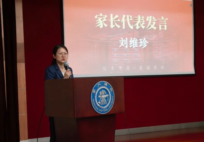 家长代表、生科2301班施云洋同学母亲刘维珍女士发言。她对于同学们能够进入交大深表骄傲,并相信大家已经做好准备,也相信学校能够将同学们培育成为心怀国家、能堪大任的青年。她从家长的角度向同学们提出几点希望:希望同学们懂得感恩,希望同学们学会面对,希望同学们勇敢担当。最后,刘维珍代表所有家长,叮嘱同学们快乐学习,健康生活,常报平安。